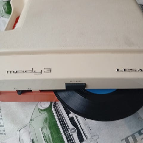 Skivspelare med inbyggda högtalare i brun finish. Spelaren har lock och inbyggda frontmonterade högtalare. Passar för uppspelning av vinylskivor i hemmet. Strömkabel ansluts på baksidan. Enkel modell som är avsedd för grundläggande musikuppspelning.