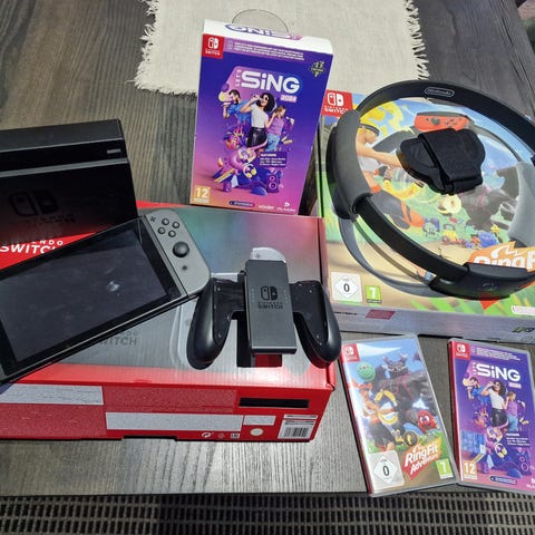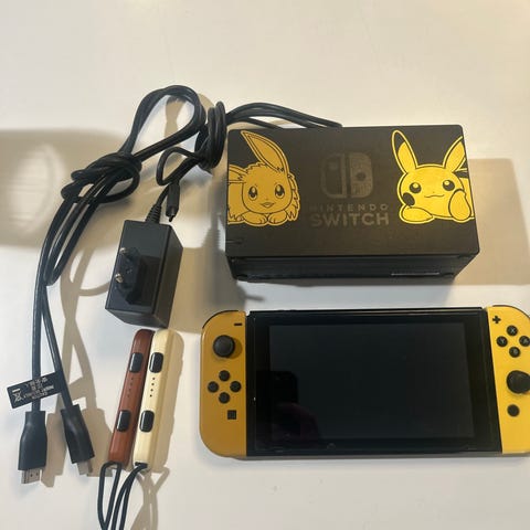 Nintendo Switch Let’s Go Pikachu & Eevee konsol med dockningsstation, Joy-Con-handkontroller och bärväska. I paketet ingår flera Nintendo Switch-spel, bland annat Super Smash Bros. Ultimate, samt extra handkontroll och laddkabel. Passar för TV-spelande hemma eller i bärbart läge. Alla delar är avsedda för Nintendo Switch-systemet.