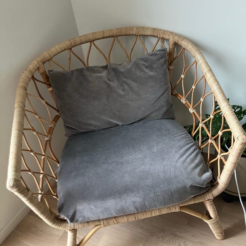 Fin och bekväm rottingfåtölj med ljusa, avtagbara dynor. Någon enstaka fläck finns men går bort i tvätt. Annats i bra skick och varsamt använd.