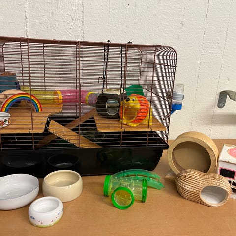 Smådjur bur i plast med gallerlock och frontöppning. Burens botten är i genomskinlig plast med löstagbara gallersektioner. Till buren följer flera tillbehör, bland annat matskål, vattenflaska, rör/tunnel, hjul, hyllplan, stegar, hus och olika gallerinsatser. Det ingår även strö och foder på bild. Passar för mindre sällskapsdjur som exempelvis hamster eller andra små gnagare, beroende på artens behov och storlek.