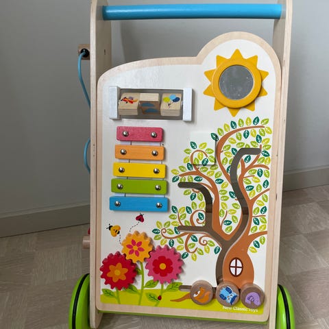 Little Dutch gåvagn aktivitetsvagn i trä med grön ram och naturfärgad aktivitetsbräda. Vagnen har flera olika aktivitetsleksaker på framsidan i form av bondgårdstema. bland annat kugghjul, skjutbara figurer, spegel och labyrint. Fyra hjul ger stabilitet när barnet övar på att gå och handtaget är anpassat för små händer. Passar som stöd vid de första stegen och som aktivitetsleksak för små barn.