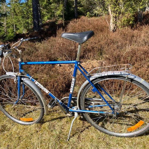 Säljer min fina cykel, inköpt 1959. För ca 5 år sedan målade jag den med rostskyddsfärg, bytte kedja och däck, även innerslangar. Cykeln har endast bakhjulsbroms, vilken behöver göras iordning, alternativt om man vill komplettera med att installera en handbroms. Dessutom fattas en mutter för att hålla sadeln på plats. Passar till vuxen mellan 165-175 cm, även till kortare personer, men då måste man sänka sadeln.