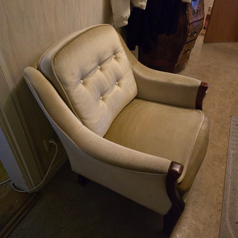 Säljer en mycket bekväm och stilren fåtölj i klassisk design. Fåtöljen har mjuk, ljus sammetsliknande klädsel med mörka armstöd i skinnimitation som ger ett elegant och lyxigt intryck. Stabil konstruktion och skön att sitta i – perfekt för vardagsrum, sovrum eller läshörna.
