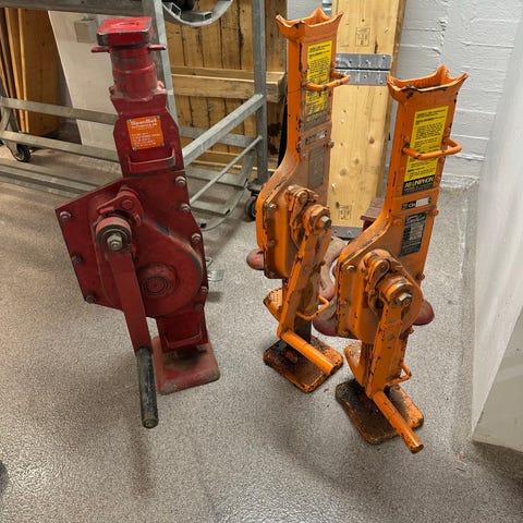Domkraft med luftkudde och två pallbockar i röd metall. Domkraften är luftdriven och har hjul samt handtag för förflyttning. Pallbockarna är märkta med maxbelastning 2000 kg och har justerbar höjd med spärrmekanism. Utrustningen är avsedd för lyft och stöd av personbil eller liknande fordon vid till exempel hjulbyte eller servicearbete. Anslutningsslang för luft följer med domkraften.