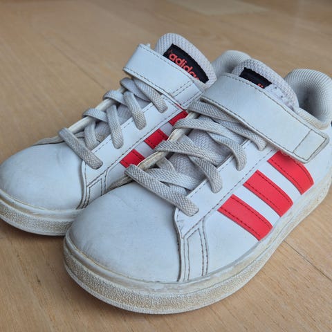 Adidas sneakers barnskor i storlek 29 för unisex. Skorna är vita med blå detaljer och klassiska Adidas-ränder på sidorna. Modell med snörning kombinerad med kardborreband upptill för enklare på- och avtagning. Ovandel i syntetmaterial med textilfoder och gummisula. Passar som vardagsskor eller till lättare aktiviteter för barn.