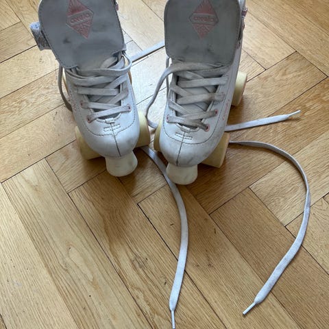 Klassisk modell med hög skaftdesign för fotledsstöd. Vit ovandel med snörning och guldfärgade detaljer. Fyra gula hjul per sko monterade på metallchassi. Bromsklossar framtill. Lämpliga för rullskridskoåkning på plana underlag.