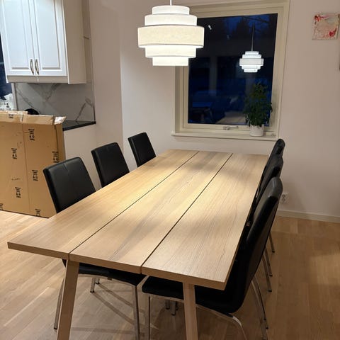 Finns en iläggs skiva lite annan kulör som följer med. Matbord i klassisk design och fingerskarvad lackad ek askfärg Bordet är 220x95.