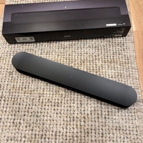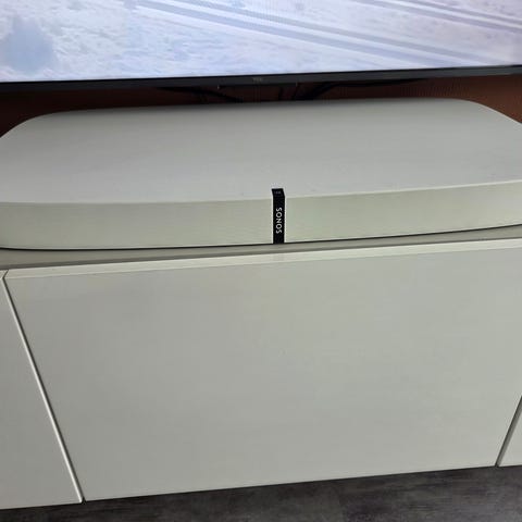 Sonos Beam gen 2 säljes i fint skick. Det enda som sticker ut att den har ett litet rivmärke från en katt på höger sidan (se bild 3)