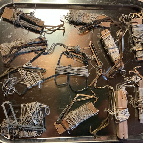 Blandning av äldre verktyg och vågar i metall och trä. På bilden syns flera fjädervågar med krok, längre stänger och handtag samt olika krokar och tillbehör. Lämpligt för den som söker reservdelar, dekoration eller vill använda dem som funktionsdugliga bruksföremål efter eventuell översyn. Märken och exakta mått framgår inte närmare av bilden.