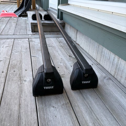 Thule takräcke i svart utförande. Består av två lastbågar med fästen. Passar bil med takfästen anpassade för denna typ av räcke. Lämpligt för montering av tillbehör som takbox eller annan last enligt Thules specifikationer. 115 cm långa. Max mellan railen på bilen ca 103 cm. Det är en tidigare version av Thule Square EVO. Två nycklar medföljer.
