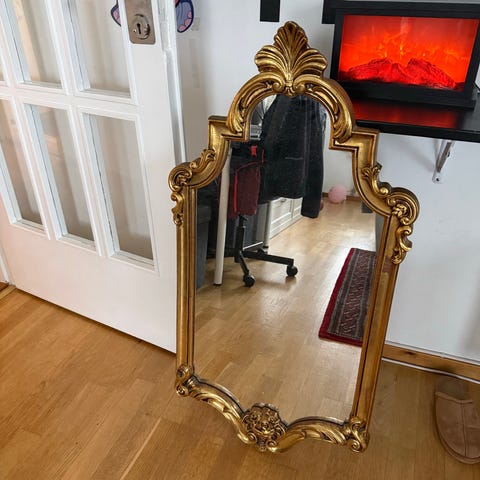 Den förgyllda ramen har en mjuk patina som ger spegeln charm och djup – perfekt för dig som uppskattar klassisk stil och detaljer med själ.