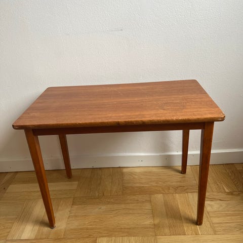 Soffbord med rektangulär bordsskiva och rundade hörn. Under bordsskivan finns en integrerad tidningshylla med ribbor. Bordet står på fyra raka ben och har en träyta i varm brun ton. Passar som soffbord eller avlastningsbord i vardagsrum eller liknande utrymme.