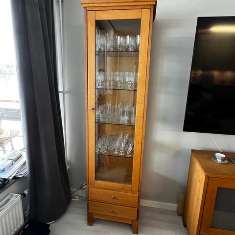 IKEA Hemnes vitrinskåp med glasdörrar och tre lådor i trä.