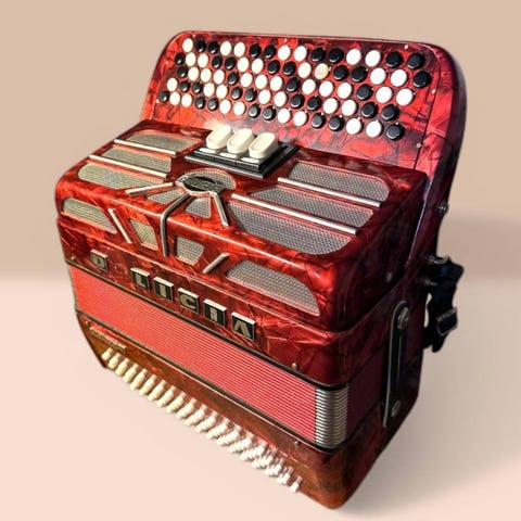 Dise pearl pianodragspel i vitt utförande med dekorativt mönster. Violinstämt. Lätt vikt. Dragspelsselen är monterad. Till dragspelet hör en svart vadderad ryggsäcksväska med bärhandtag och axelremmar för transport och förvaring. Köpt nytt 2019. Obetydligt använt.
