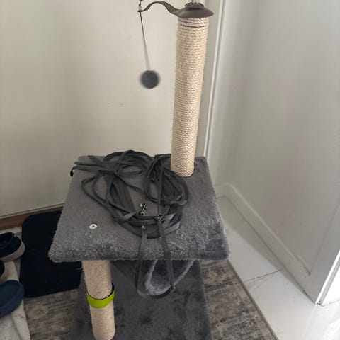 Egentillverkat klösträd för katt med naturträstam och lindat sisselrep för klösning.