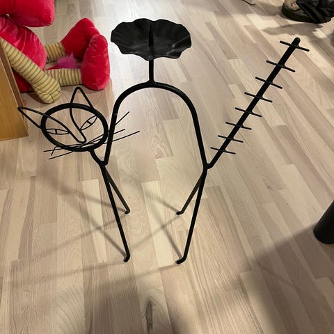 Ljusstake i svart smidesjärn. Modellen har flera armar för stearinljus och dekorativa hängen. Passar som bords- eller bänkljusstake i kök, vardagsrum eller matsal. Designen är robust med tydlig smideskaraktär och står på ben som ger stabilitet på plana ytor.