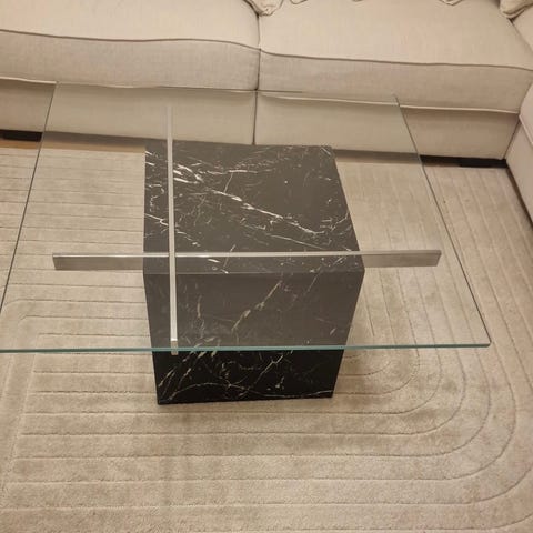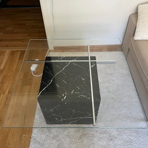 Soffbord ,skiva klarglas ,underrede svart marmormönstrad folie