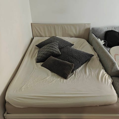 IKEA säng i grått tygklätt utförande. Sängen har en rak huvudgavel och står på ben som ger utrymme under sängen. Passar som enkelsäng i sovrum, gästrum eller studentbostad. Madrass, täcke och kudde kan ingå. Kan hämtas från 7/3.