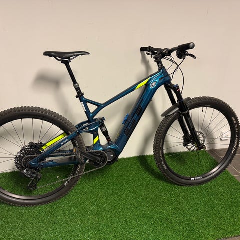 Rock Machine Blizzard 2023 elcykel med RockShox framgaffel och bakre stötdämpare, båda med 130 mm slaglängd.