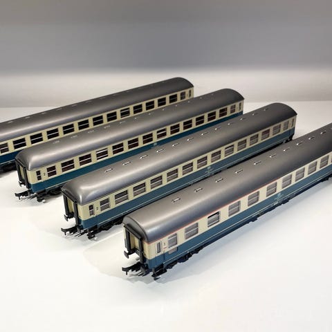 Vagnset från franska Röwa. Välgjorda vagnar med inredning, kulisstyrda NEM kortkoppel för verklighetstrogen kort avstånd mellan vagnarna. Bra bruksskick, hela och inga skador med mindre spår av bruk som skav och fläckar förekommer. Skickar med ett Märklin NEM koppling så vagnarna kan kopplas ihop med system som Märklin, Roco, Fleischmann mm. Setet består av: