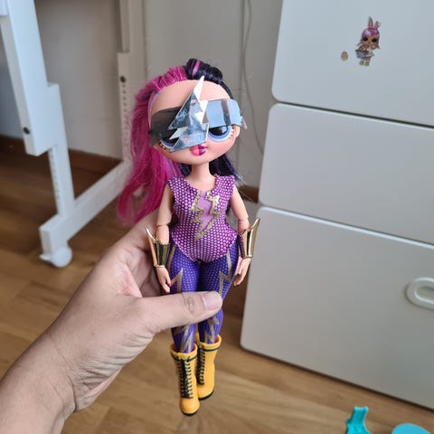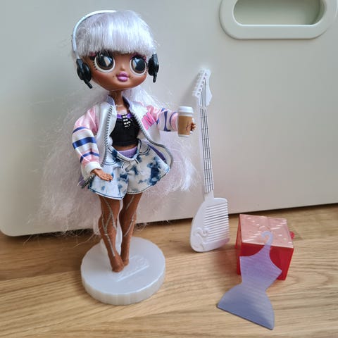 L.O.L. Surprise docka med långt rosa hår. Dockan står på en rund dockställning och har kläder i starka färger. Till dockan följer flera tillbehör, bland annat en blå jacka, rullskridskor, solglasögon, handväska, små accessoarer samt en rund spegelliknande del. Passar för lek och rollekar med mode- och stylingtema.