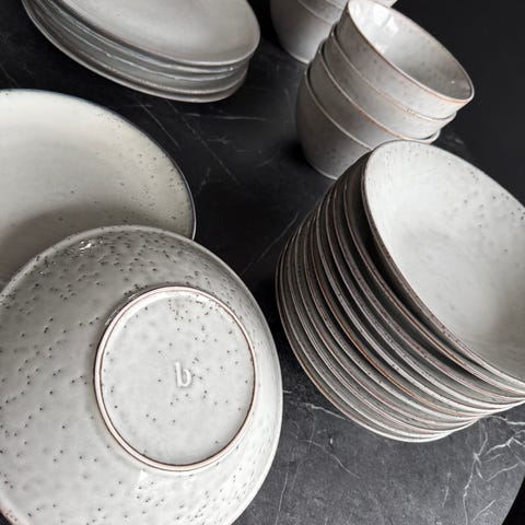 Tine k home skålar i porslin med gråvit marmorerad dekor. Setet består av två skålar i olika storlek, lämpliga för servering av exempelvis sallad, snacks eller tillbehör. Skålarna har glaserad insida och utsida med dekorativ spiralstruktur och tryckt Broste Copenhagen-stämpel undertill. Passar för användning i kök och vid dukning.