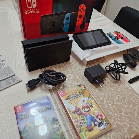 Komplett Nintendo Switch set i originallåda med alla originaltillbehör (sladdar också) och ett extra par Joy-Cons, ett spel och ett 128GB Micro-Sd minneskort. Redo att spelas!