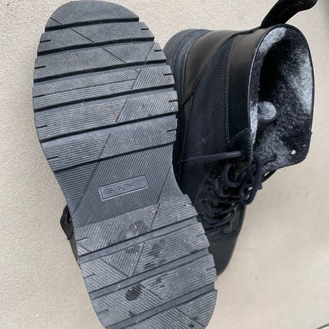 Kraftig gummisula med grovt mönster och snörning framtill med metallhakar. 100% läder med vadderad kant runt ankeln. Promenad, vandring mm.
