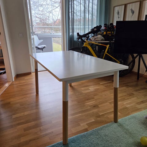 IKEA skrivbord i vitt. Höjden på benen kan ställas in efter behov, vilket gör bordet lämpligt som arbetsbord eller studiebord. Bordsskivan har en rostfläck som syns på bilden.