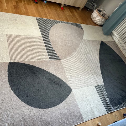 Matta med triangelmönster i olika grå nyanser. Rektangulär modell som passar exempelvis under soffbord eller i vardagsrum. Mattan har vävd baksida och är avsedd för inomhusbruk. Geometriskt mönster som gör att den fungerar i många olika inredningsstilar. 140x190