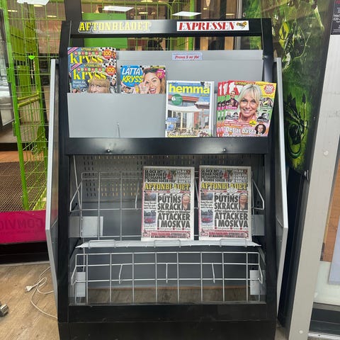 Tidningsställ. Fristående ställ för exponering av dagstidningar, med flera fack i höjdled. Passar för butik eller annan offentlig miljö där man vill ha en samlad plats för tidningsutdelning.