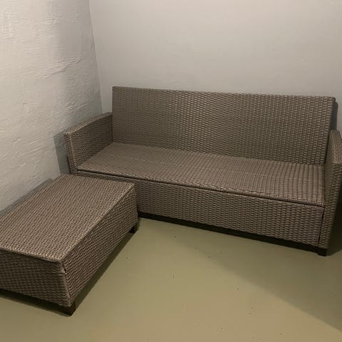 Svart konstrotting soffa , bord och 2 lösa pallar . Kan sättas ihop till divan eller fristående.Dynorna har blivit lite solblekta men annars hela . Inköpt för ca 3 år sedan på Bauhaus .