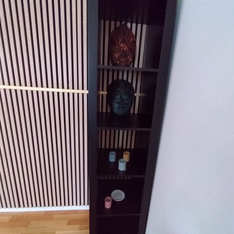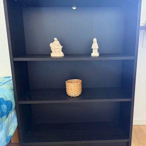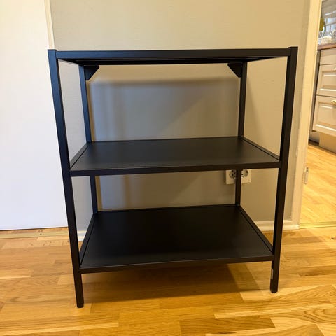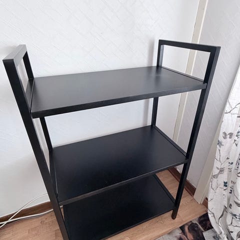 IKEA hylla i svart färg med tre öppna hyllplan och ett översta plan med ram runt. Hyllan är fristående och lämpar sig för förvaring av böcker, kontorsmaterial eller andra mindre föremål. Passar i exempelvis vardagsrum, kontor eller hall där extra förvaringsutrymme behövs.