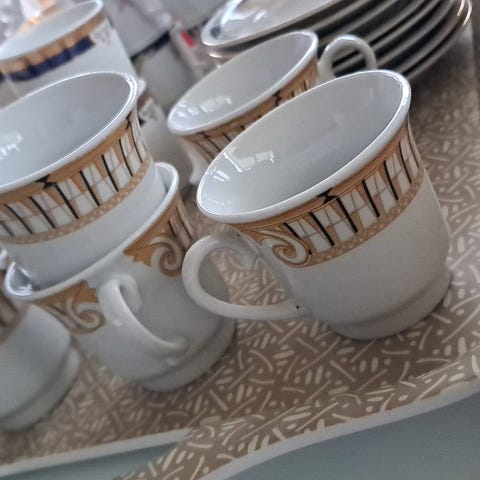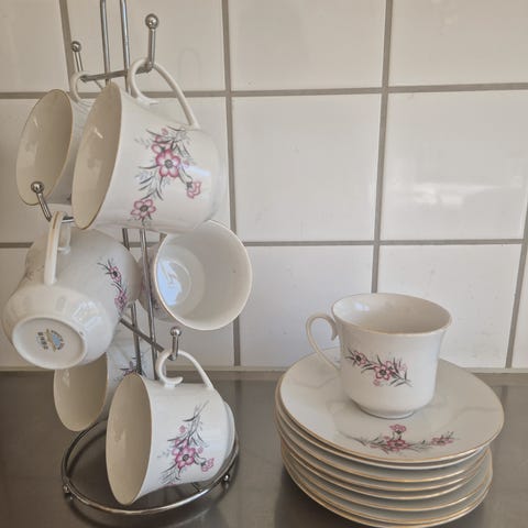 Porslin kaffekoppar med fat i vitt med blommigt mönster och dekorativ kant. Setet består av flera stapelbara koppar med handtag samt matchande assietter. Passar för servering av kaffe, te eller andra varma drycker vid vardag och enklare bjudningar. Finns lite defekter så som färg och hack se bilder