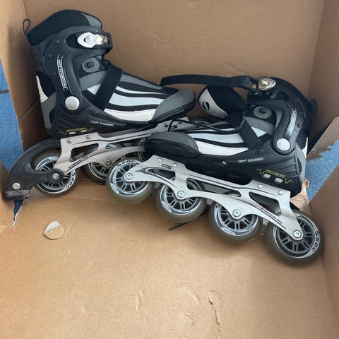 CC rullskridskor inlines i storlek 44. Modellen har hård yttersko med justerbara spännen och kardborreband för stabil passform. Ovandelen är i syntetmaterial med meshpaneler för ventilation. Skridskorna har fyra hjul per sko monterade på en ram i plast/komposit. Passar för inlinesåkning på asfalt och andra jämna underlag.