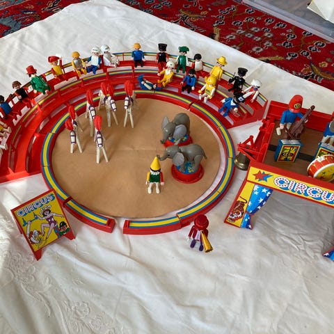Playmobil cirkuslekset med stort cirkustält, manegering och flera tillbehör. Setet innehåller bland annat olika Playmobil-figurer, djur, fordon, staket, rekvisita och smådelar som hör till en cirkusmiljö. Passar för barn som vill skapa egna cirkusscener och rollekar med figurer och tillbehör i plast. Innehåller ytterligare hästar, riddarkung, musikband som spelar låtar, två brandmän och en brinnande bil. Ingår även campare med ryggsäckar.