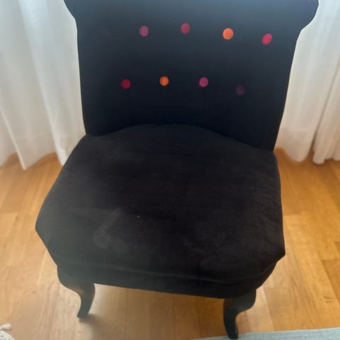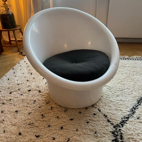 Svart rund roterande designfåtölj. Lite skavd i kanterna men fungerar fint. Vet ej ålder eller märke