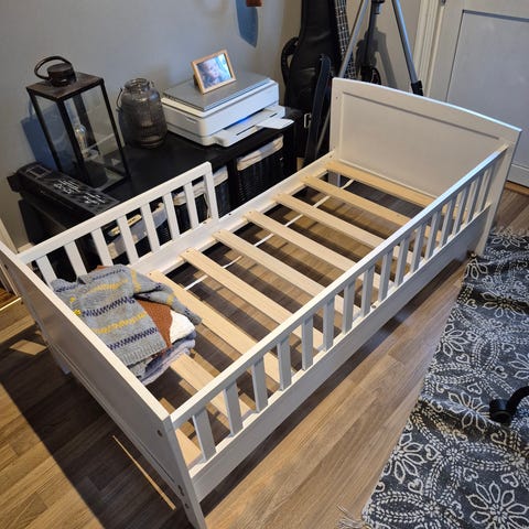 IKEA juniorsäng i svart trä. Sängen har ribbotten i trä och är avsedd för barn. Lämplig som övergångssäng mellan spjälsäng och fullstor säng. Justerbar från 137 till 207 cm