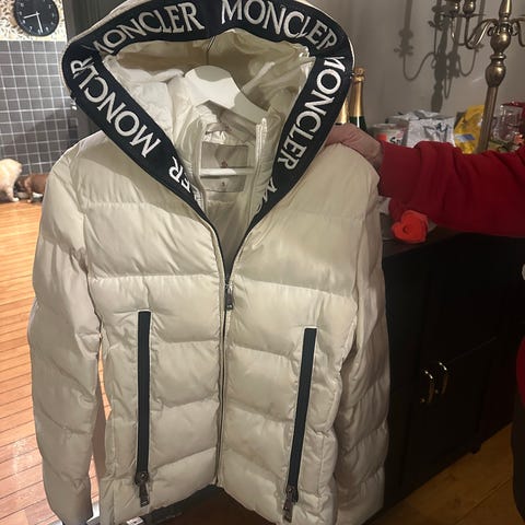 Moncler dunjacka för dam i beige färg. Jackan är i one size och har vadderad front i dun med stickade partier på ärmar och axlar. Dragkedja framtill och hög krage. Materialet innehåller dun som fyllning, vilket ger värme och lätt vikt. Passar som ytterplagg under kyligare väder. Den är i M storlek.