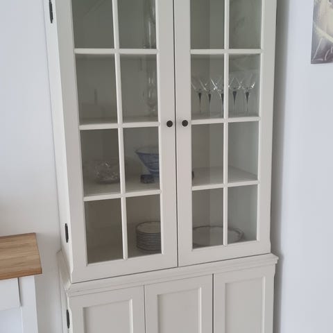 Vitrinskåp i gustaviansk stil. Bedömmer skåpet att vara i fint skick, förutom en skada i ena dörren som syns på bild. Detta är inget som stör funktionen och det syns ej när vitrinskåpet är stängt.