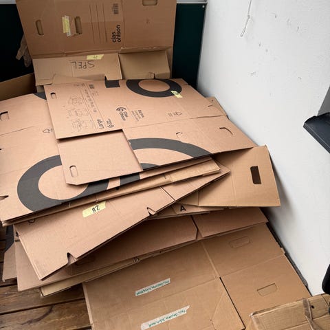 11 moving boxes. 7 are super strong and very easy and quick to build. The others are a different brand. One box has a slight tear but otherwise they are all in a very good condition. We add also a bag with differently sized pieces of bubble wrap to the package.