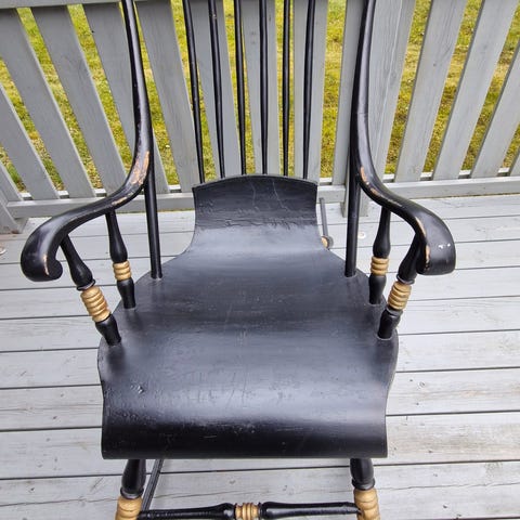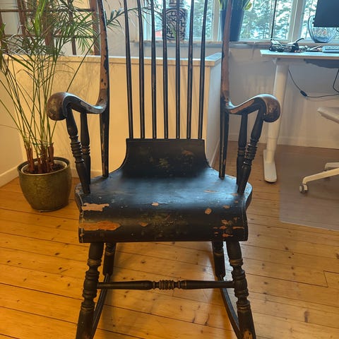 Fåtölj i form av gungstol med svarvade trädetaljer och gul textilklädsel på sits, rygg och armstöd. Passar som sittmöbel i vardagsrum, läshörna eller liknande utrymme. Klassisk modell med hög rygg och armstöd som ger stöd vid sittande.