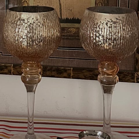 Ljuslyktor på fot i glas och metall. Setet består av flera ljuslyktor i bägarmodell med hög, smal metallfot och rund fotplatta. Överdelen är i frostat eller lätt mönstrat glas, med dekorativ kant upptill. Passar för värmeljus eller mindre ljus och kan användas som stämningsbelysning på bord, hylla eller fönsterbräda i hemmet. I fint skick. Den mindre lyktan har tappat en dekoration men inget man tänker på.