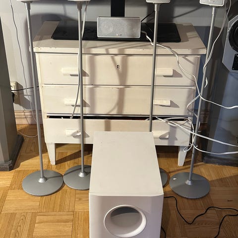 De stora högtalarna är målade av tidigare ägare men jag har köpt färg för att måla om dessa dock inte hunnit. Färgen som är vit kan får med om man vill ha det.