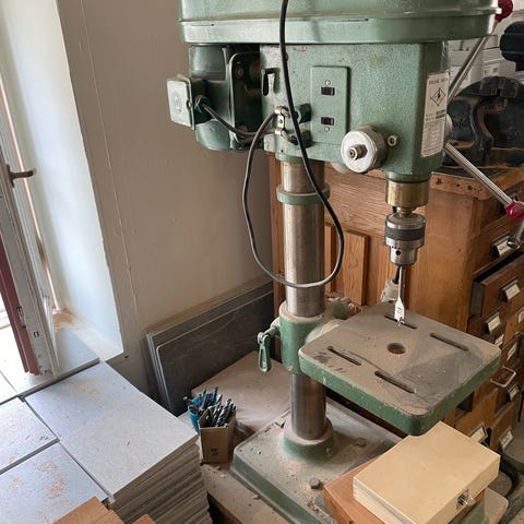 AEG BST 717 borrstativ i metall. Stativet är avsett för att hålla en handborrmaskin i fast läge vid borrning. Det har en stabil bottenplatta med fästhål för montering i bänk eller bord, vertikal pelare och hävarm för styrd nedmatning av borren. Utrustat med fjäderretur och justerbart fäste för borrmaskin. Lämpligt för precisionsborrning i verkstad, garage eller hobbybruk. Nypris 910kr