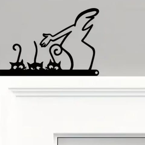 dekoration skylt för kök med utskuren text "KITCHEN" och kattmotiv. Skylten är i svart färg och är avsedd som vägg- eller dörrdekoration, exempelvis ovanför köksdörr eller på vägg i kök. Passar som inredningsdetalj i hemmet där man vill markera köksutrymmet på ett tydligt sätt.