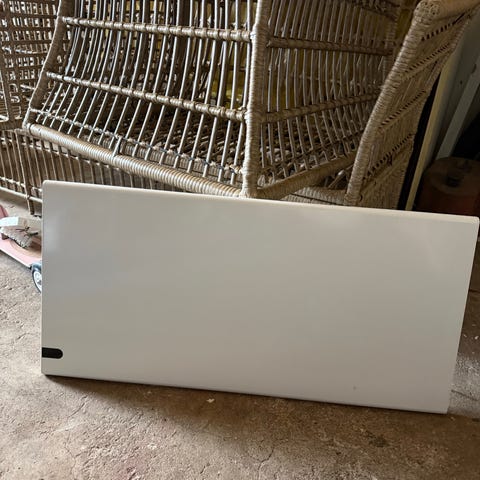 Väggmonterad panelradiator med överliggande luftutsläpp. Radiatorn ansluts till eluttag enligt medföljande bruksanvisning. Manual medföljer enligt bilder.