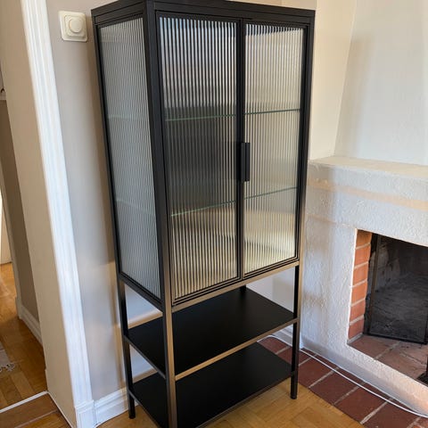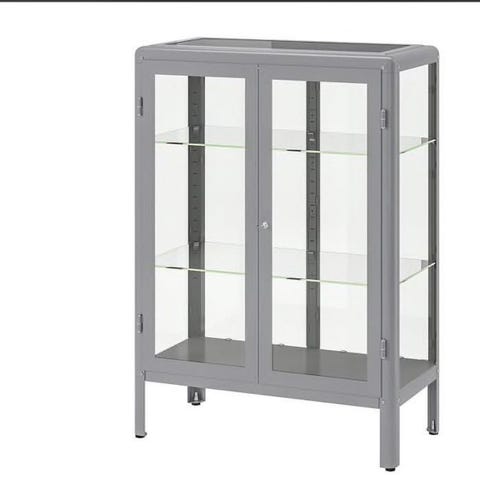 Säljer vårt vitrinskåp från IKEA i modellen Fabrikör i samband med flytt. Glas och stålytorna är i fint skick utan repor eller defekter. Låsmekanismen har gått sönder och jag har tillfälligt satt in en magnet i botten av skåpet som fäster mot dörren så att den håller sig sluten. Lägger man lite tid på det kan man få till en snyggare lösning. Nypris hos IKEA 1995kr.