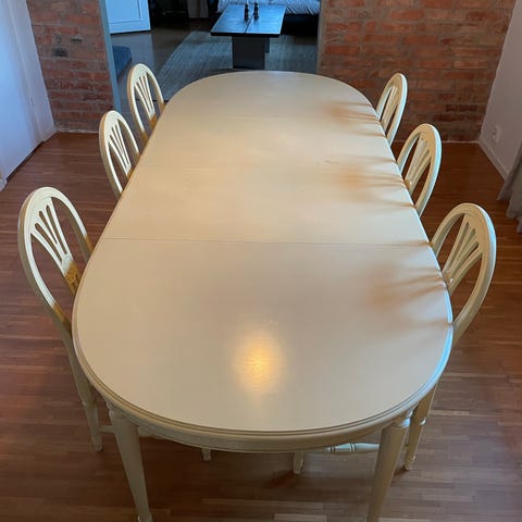 Möblerna på bilden är en matsalsgrupp i gustaviansk stil från 1900-talet. Denna typ av klassisk svensk möbelgrupp är vanlig på den nordiska marknaden och kännetecknas av sina räfflade detaljer och ljusa färgsättning.