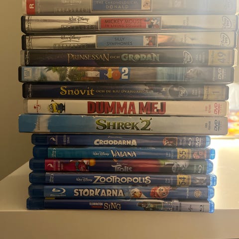 Disney Blu-ray filmer Dumbo, törnrosa, husdjurens hemliga liv, Djungelboken, Alice k underlandet, hitta Nemo, alladin och pinocchio.